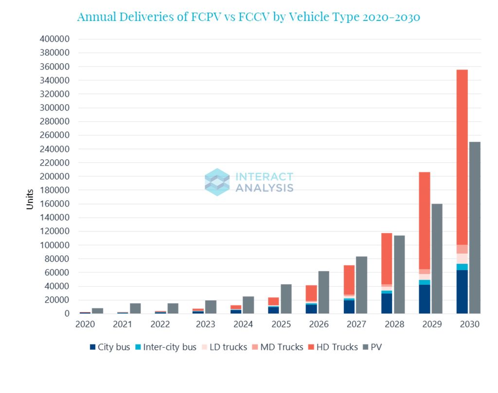 中国:将引领全球燃料电池汽车市场。中国将在2025年超越韩国成为全球燃料电池汽车销量领头羊,预计2030年全球80%的燃料电池商用车销量来自中国。