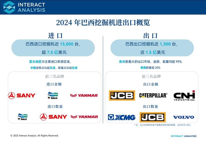 巴西挖掘机市场呈现明显的进口导向特征。2024年,巴西进口近1.5万台挖掘机,进口金额累计超7.5亿美元,是挖掘机出口的五倍。月度来看,进口市场上半年表现明显好于下半年,整个上半年呈现波动上升态势。进口数量峰值在6月出现,单月进口挖掘机超1700台,金额峰值出现在5月,单月进口金额超0.9亿美元。出口市场平稳,数量及金额峰值在5月出现。