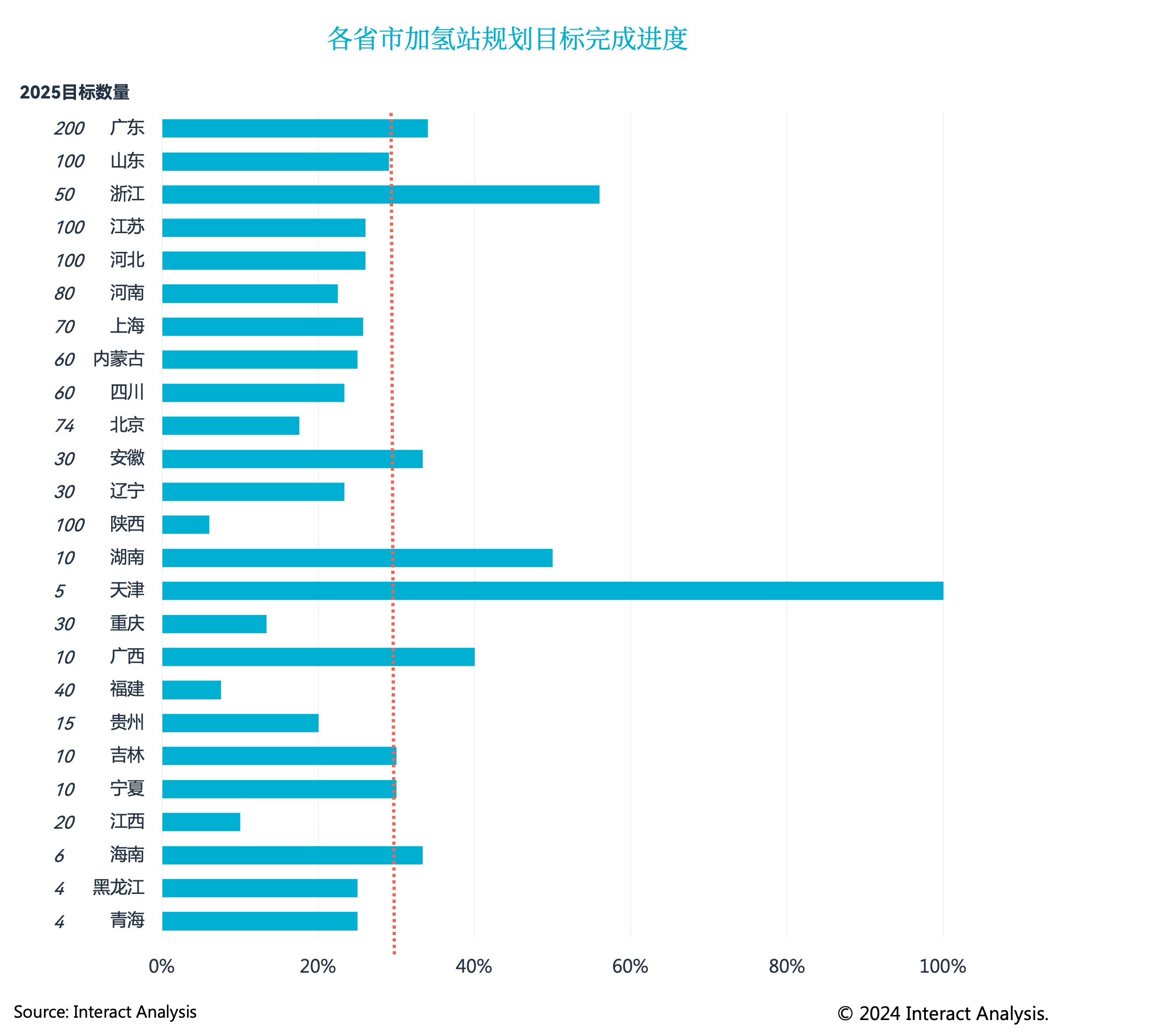 随着氢能车辆的推广应用,各地加速布局配套加氢站建设。Interact Analysis梳理已公布政策显示,截至2023年底,全国各省市规划到2025年建成超1200座加氢站。但实际建设情况如何呢?